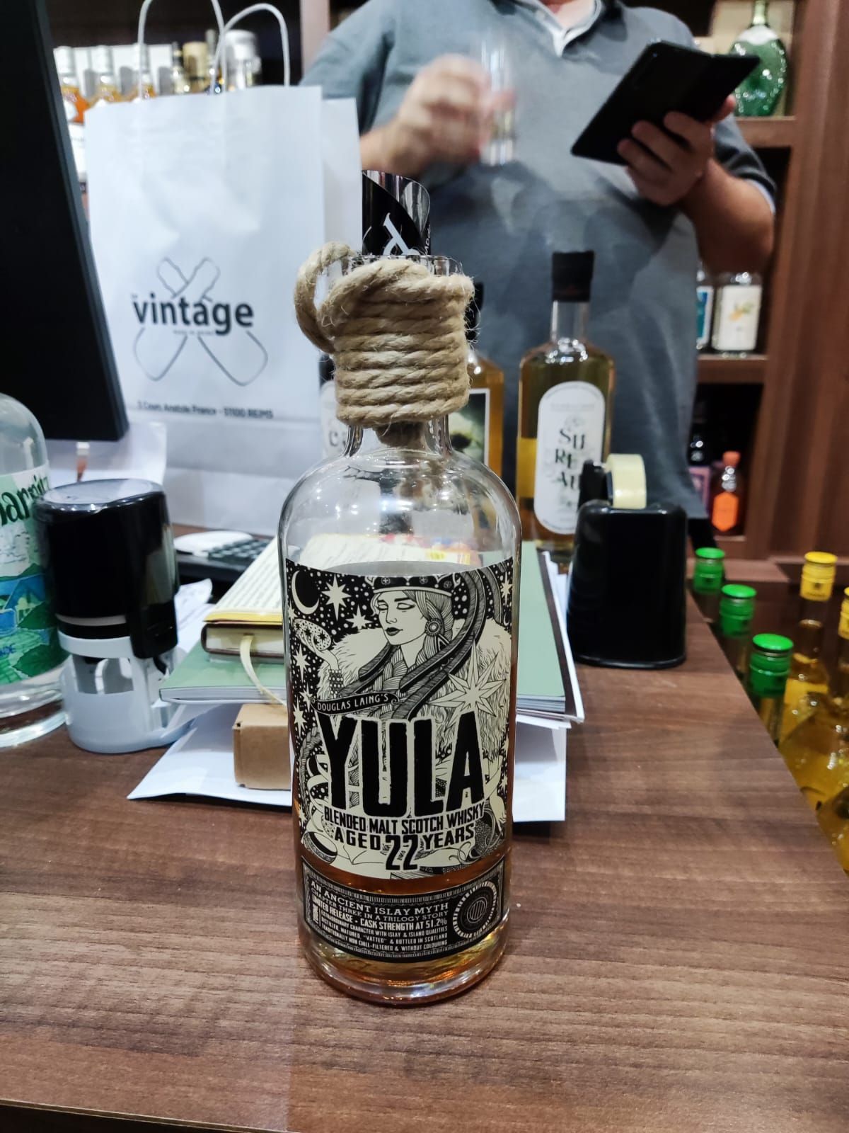 Pour l’occasion, j’ai eu le plaisir d’offrir à la dégustation une bouteille de l’un de mes embouteilleurs indépendants préférés en matière de tourbe : Un Douglas Laing’s : Yula 22 ans ( avec le conseil de Louka ), titrant à 51,2°.
