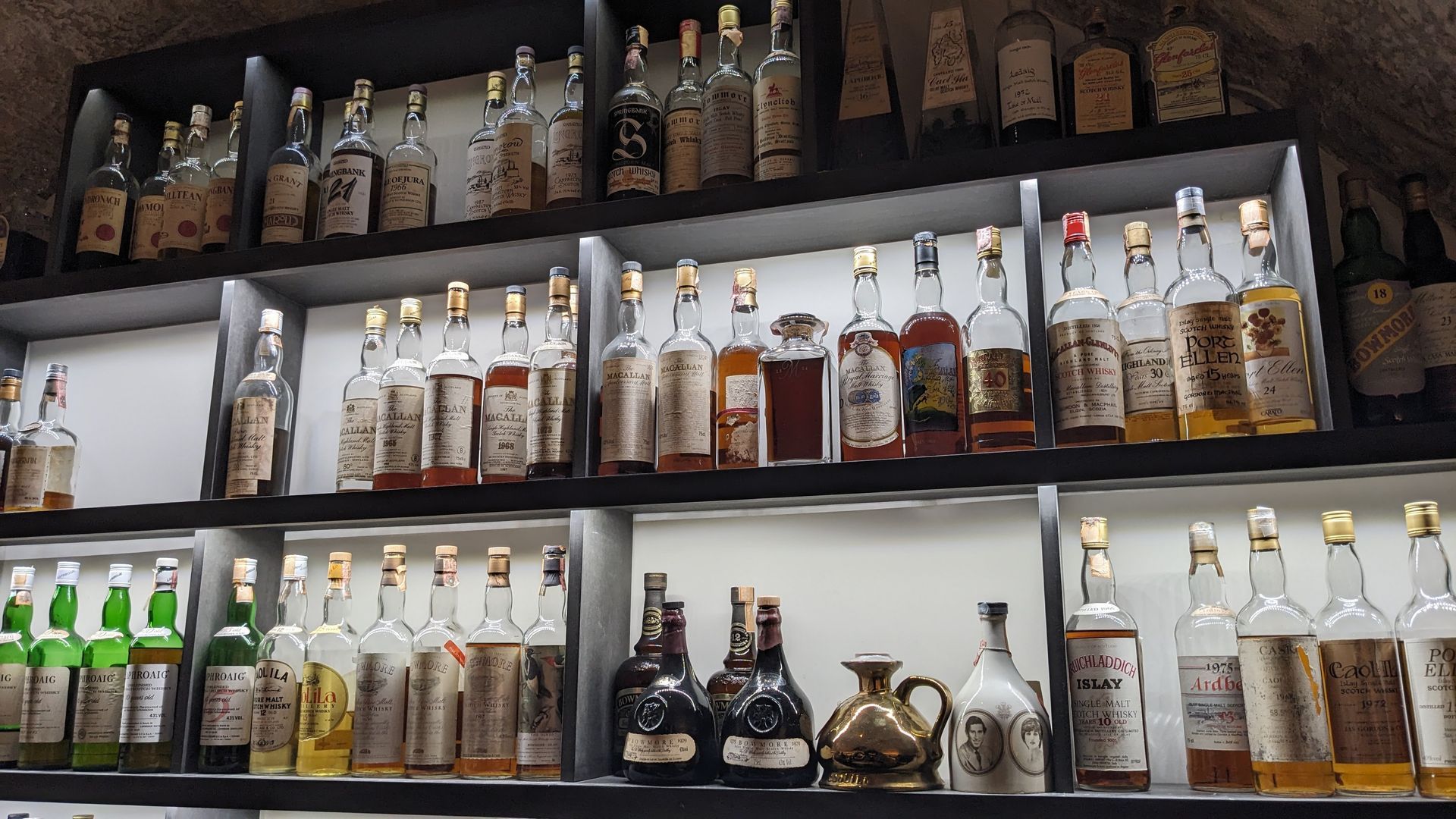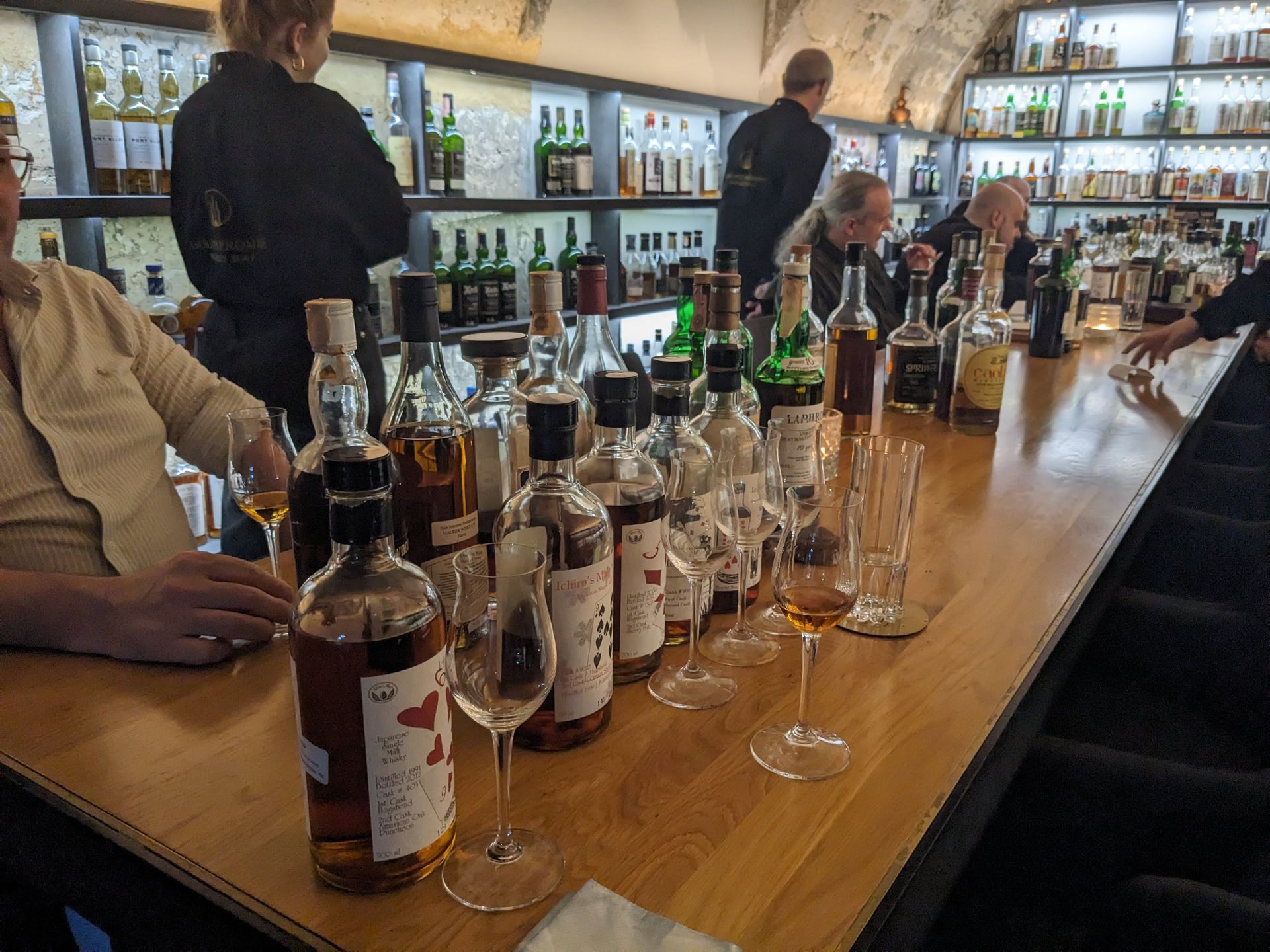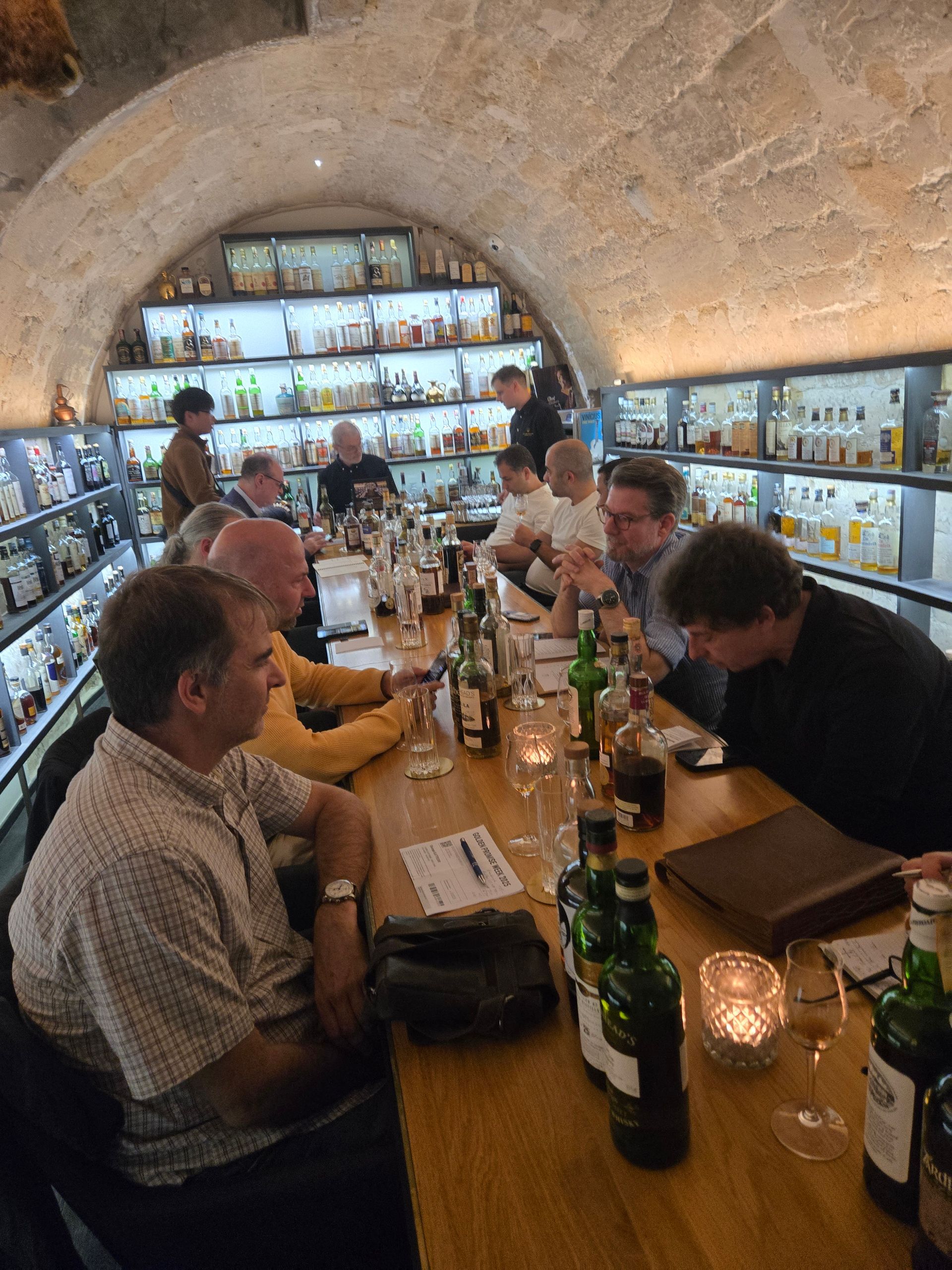À peine arrivés, nous sommes pris en charge et conduits dans un salon privé. Le cadre est tout simplement mythique : une cave voûtée, des étagères chargées de flacons rares, et devant nous, des bouteilles de whisky toutes plus prestigieuses les unes que les autres.