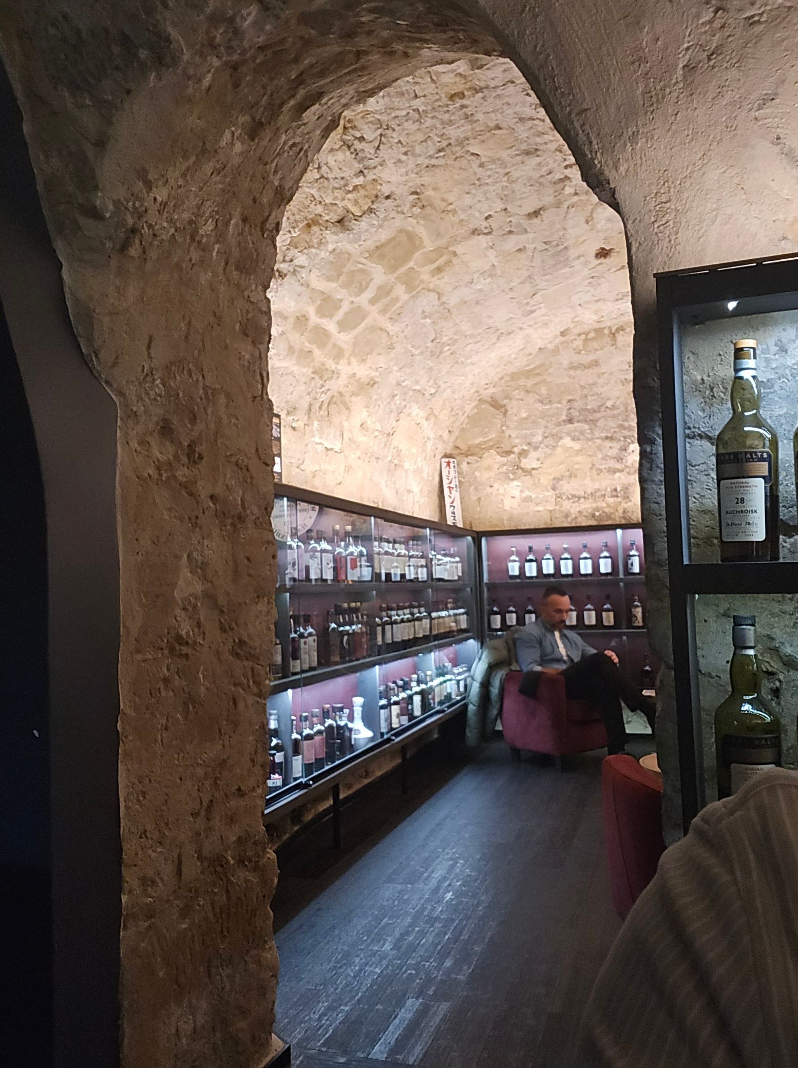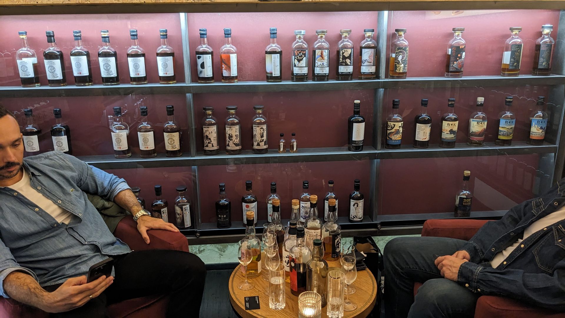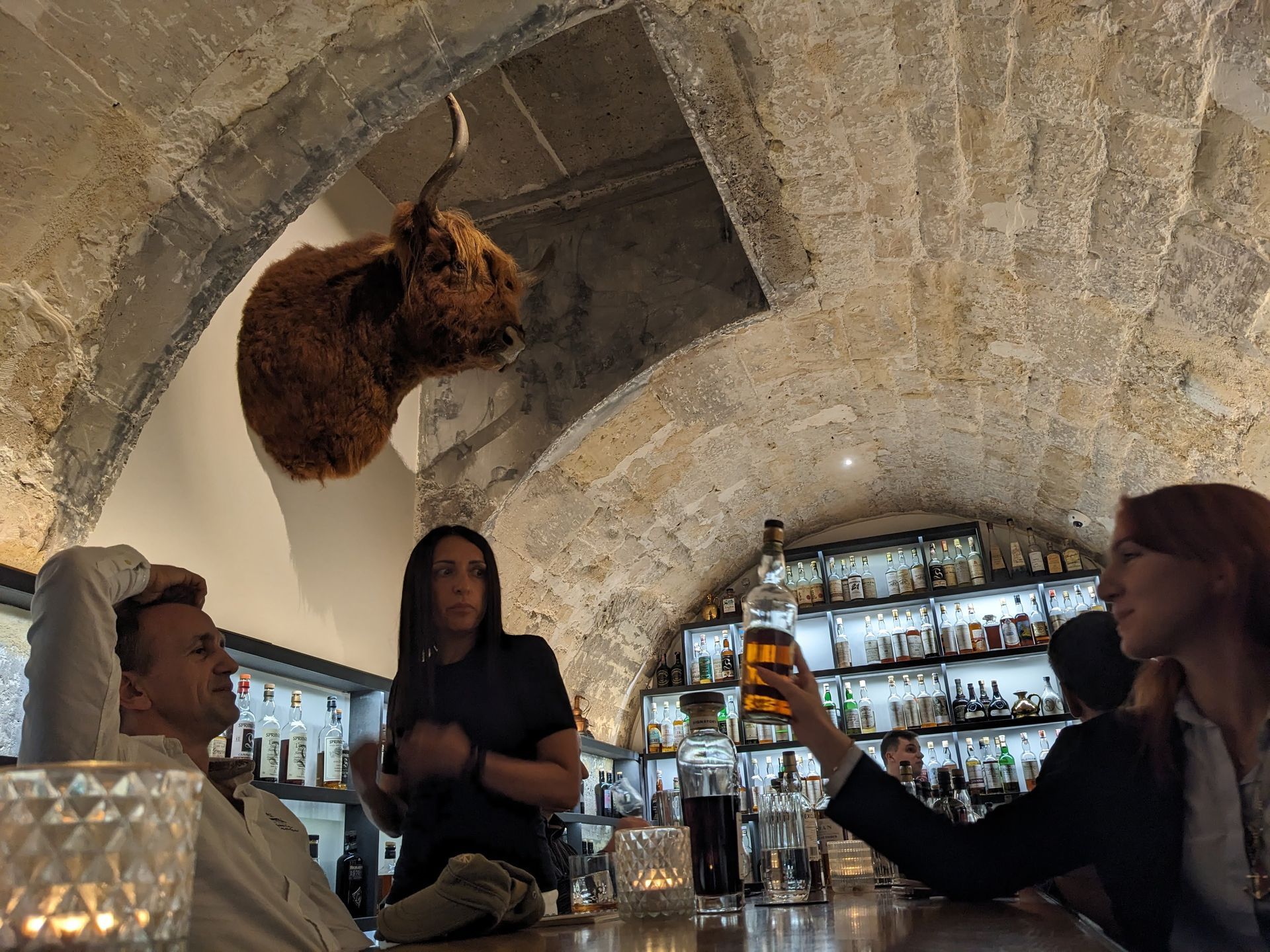 À peine arrivés, nous sommes pris en charge et conduits dans un salon privé. Le cadre est tout simplement mythique : une cave voûtée, des étagères chargées de flacons rares, et devant nous, des bouteilles de whisky toutes plus prestigieuses les unes que les autres.